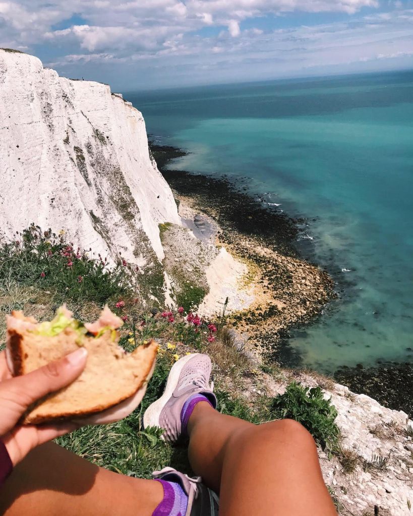 I finally stopped for lunch and ate the sandwich I’d packed on the edge of one of the cliffs, overlooking the beautiful White Cliffs of Dover. The view was incredible. A stark white cliff sat against clear blue water that tossed its gentle waves against brown, algae-covered rocks below, as chalky white and gray rocks sunbathed on the beach. Tourists plunked themselves next to me one-by-one, not really taking in the cliff itself, but snapping pictures, first of the cliff, then of themselves in front of the cliff, and then moving on. As I finished my sandwich, a very opportune group walked up to me, tapped me on the shoulder and showed me a couple pictures they’d taken of me eating (nice), and then offered to send me the pictures. I smiled, half embarrassed half flattered, and accepted them. Very unceremoniously, in return, they asked me to vacate my spot so that they could take their own pictures. As they pointed to my seat, my jaw loosened on the clementine I was chewing. I looked side to side at ALLLL the cliff they could go sit on to take a picture, and felt a mix between a tight-lipped, fake-polite smile and an eye roll making their way to my face to replace the friendlier smile that had been there before.